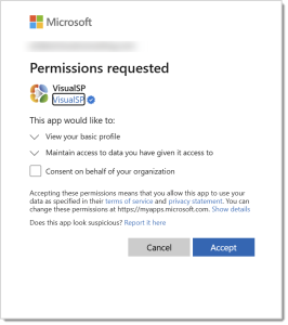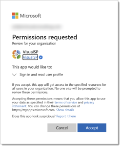 The VisualSP app requires permission to read the profile of subscription editors / admins logging in, so that it can validate that the username used for authentication matches the email that is authorized for editor / admin permissions within the VisualSP subscription.