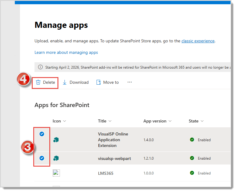 - Select the 'VisualSP...' app (and the 'visualsp-webpart' app, if you have it).