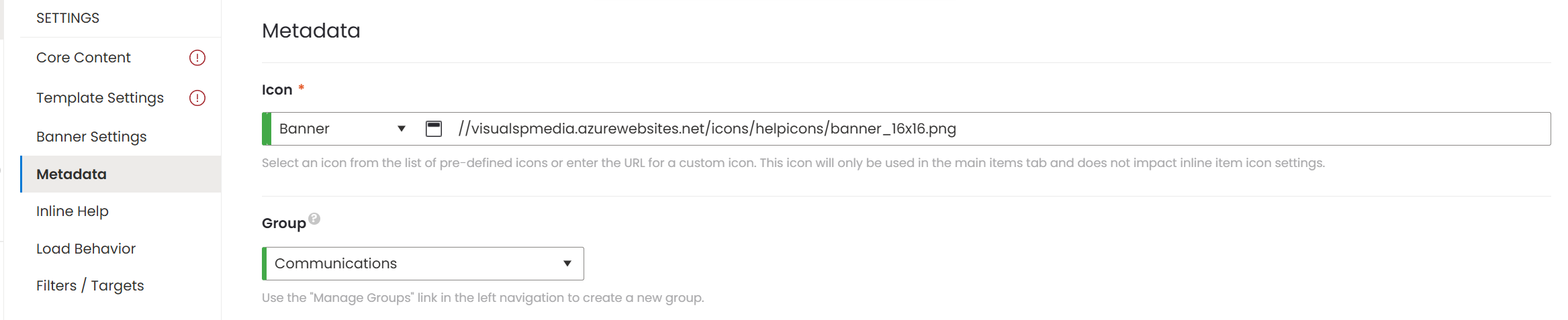 - From the Help Item Editor page, click the Template Settings option in the Settings Menu to provide information to identify the template