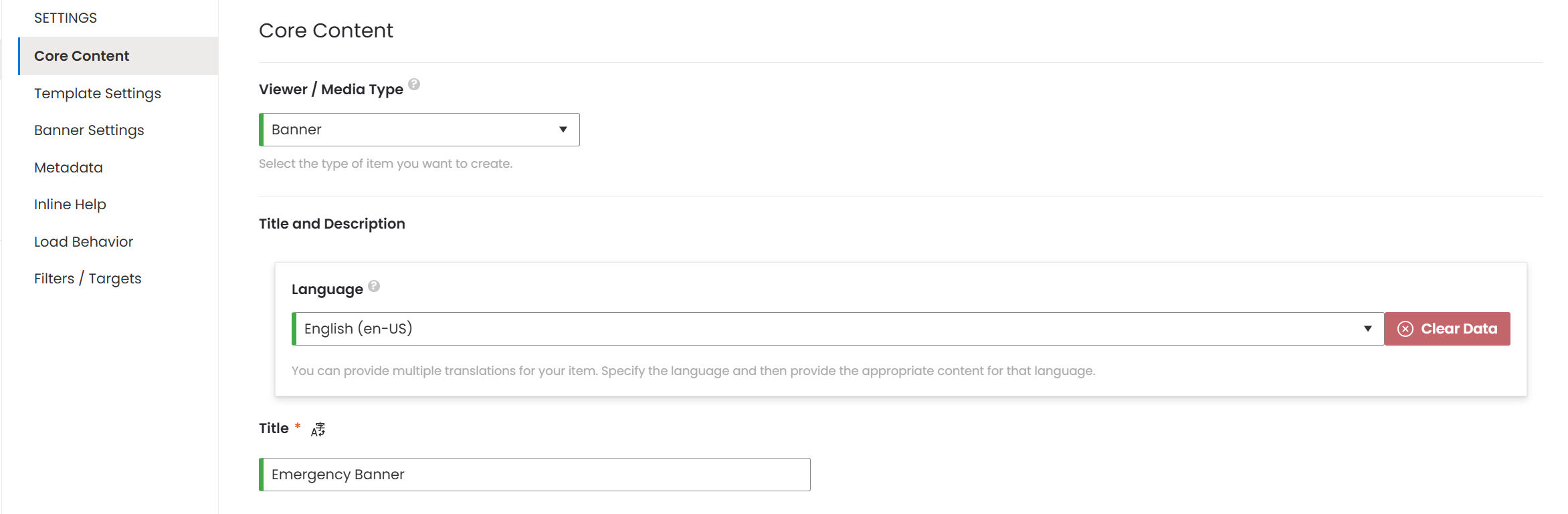 - From the Help Item Editor page, click the Core Content option in the Settings Menu to create the template content to be inserted when the template is selected.