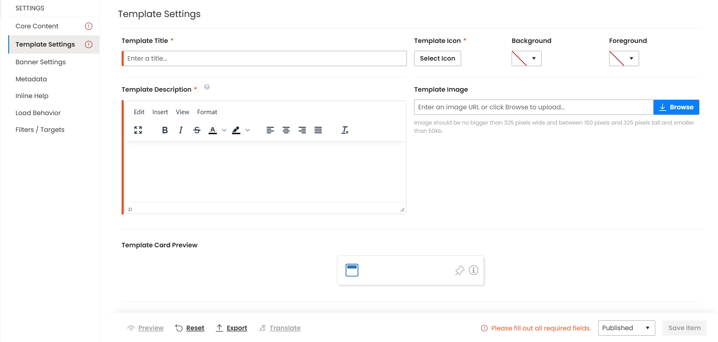 - From the Help Item Editor page, click the Template Settings option in the Settings Menu to provide information to identify the template