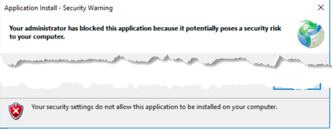 This is caused by the "ClickOnce Trust Prompt Behavior": https://msdn.microsoft.com/en-us/library/ee308453.aspx To adjust this, simply change the values in the Registry and you should be able to install the application. To enable the ClickOnce trust prompt, open the registry editor:- Click Start, and then click Run.